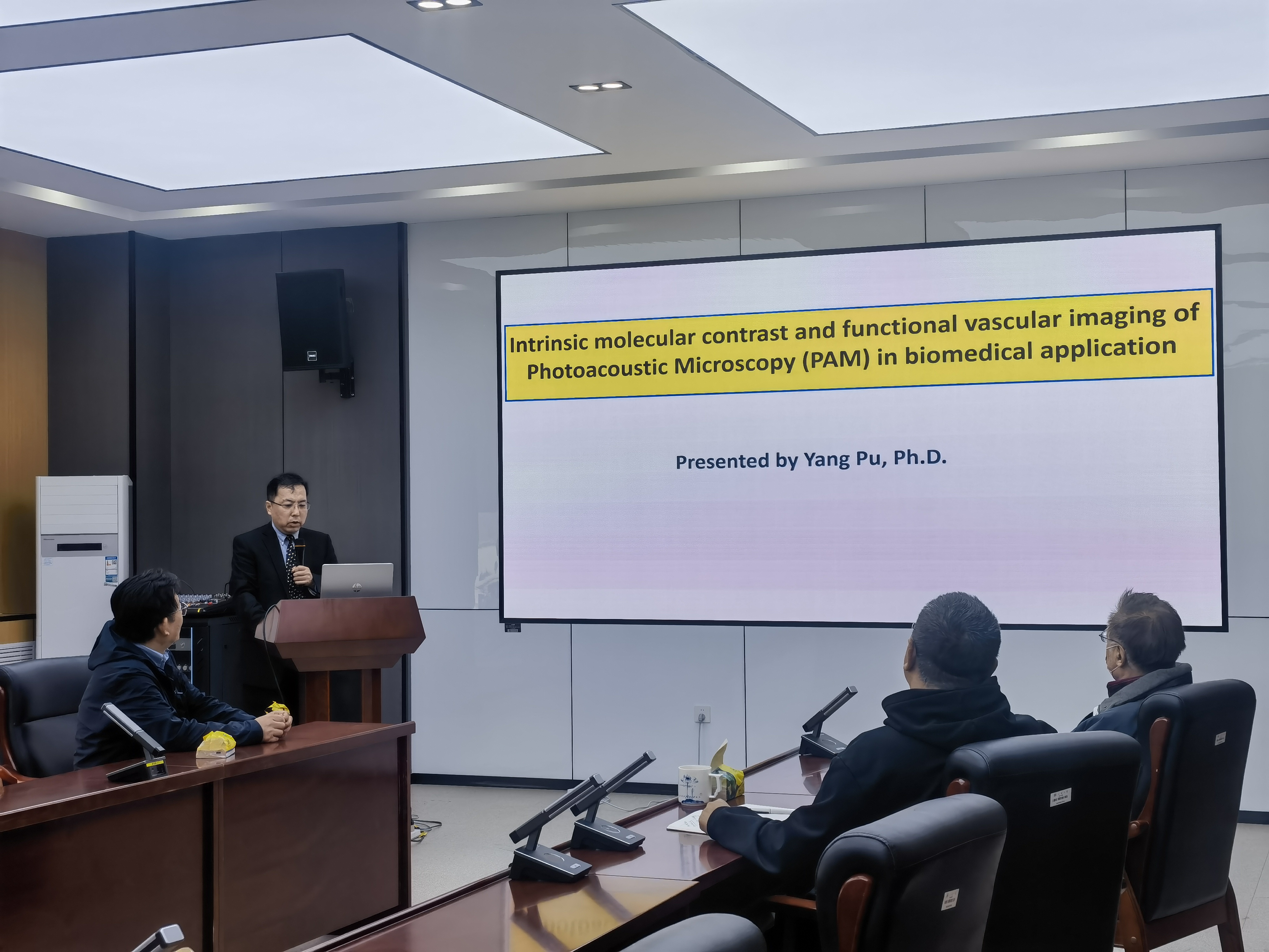 11月8日上午,应光学高等研究中心王春教授邀请,普阳博士于会文北楼D区作“光声显微镜在生物医学应用中内源分子和血管功能成像(Intrinsic molecular and functional vascular imaging of Photoacoustic Microscopy (PAM) in biomedical application)”主题讲座。