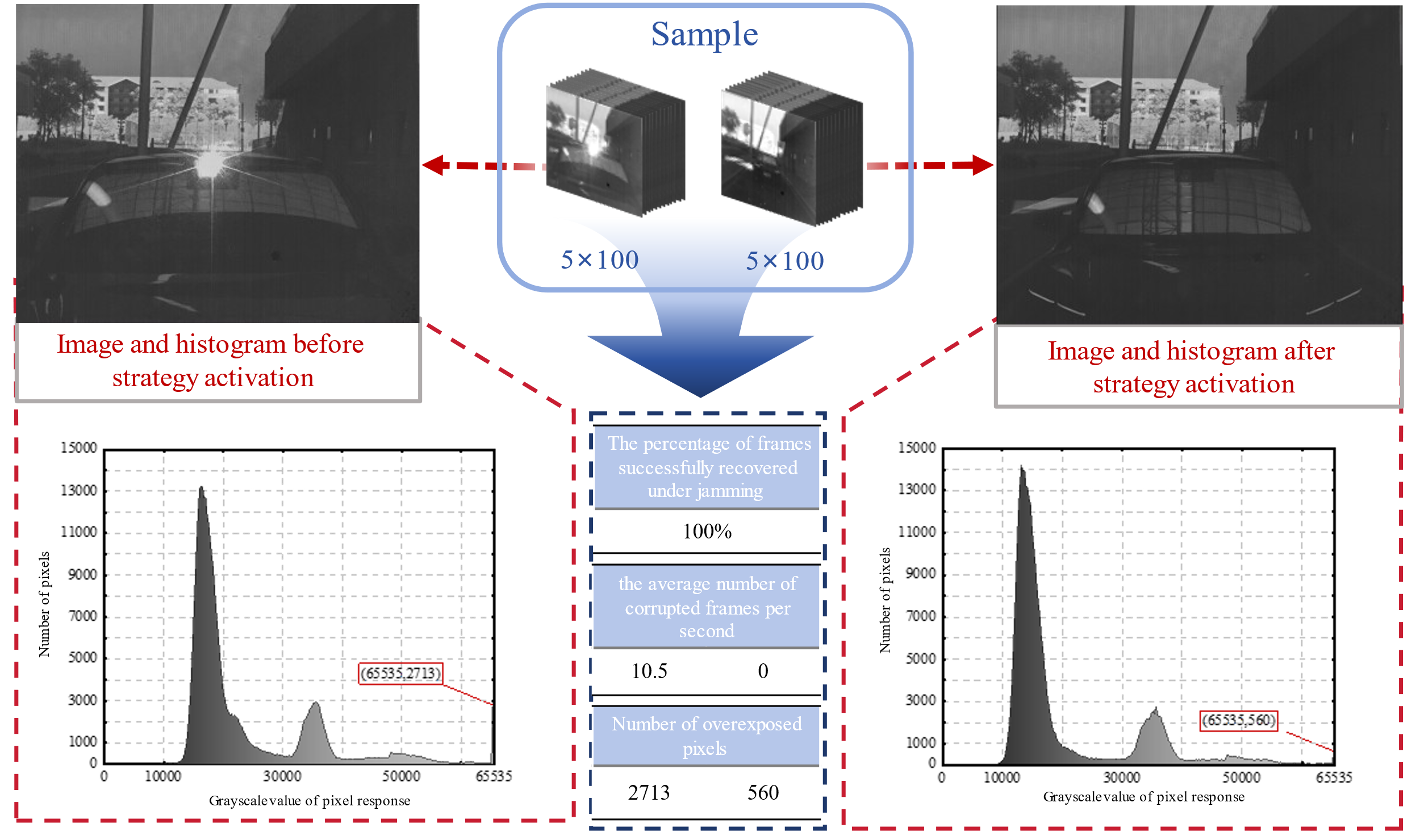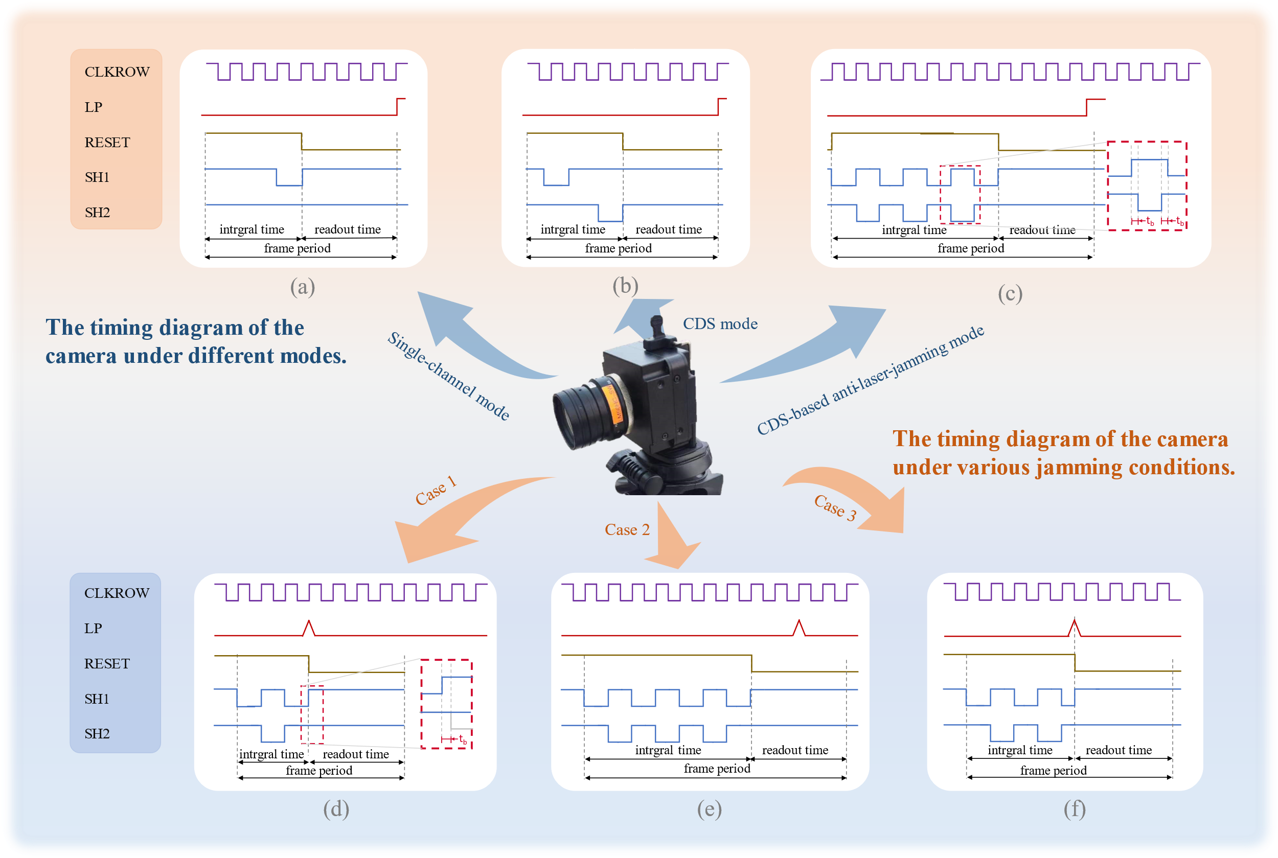 针对该问题,研究团队提出一种基于相关双采样(CDS)的抗激光干扰成像策略。通过交替式双通道采样机制,相机可在激光干扰环境下持续工作,确保至少获取一帧完整图像。团队搭建了由激光干扰模块、光电探测与控制模块、高速比较器模块以及短波红外(SWIR)相机组成的实验系统进行验证。在不同激光重复频率与脉冲宽度条件下开展了实验室模拟实验,随后利用机械式激光雷达系统进行抗激光干扰实验,并在道路场景中完成实车测试。结果表明,基于相关双采样的抗激光干扰策略可有效抑制激光雷达引发的干扰,在道路环境下实现稳定、高保真的成像效果。该研究在自动驾驶、监测监控及安防等领域具有广阔的应用前景。
